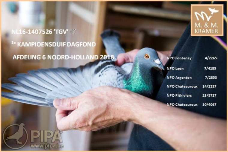 賽鴿NL16-1407526被馬丁和瑪麗特命名為“TGV”,他能夠沿著前輩“哈利”的腳步,獲得了WHZB/TBOTB全國當日歸長距離最佳賽鴿頭銜。TGV的父親“超級哈利”(NL14-1219787 Super Harry)是“哈利”的直孫。“超級哈利”作育子代“紅哈利”(Red Harry)獲得NPO拉索特年2875羽冠軍。