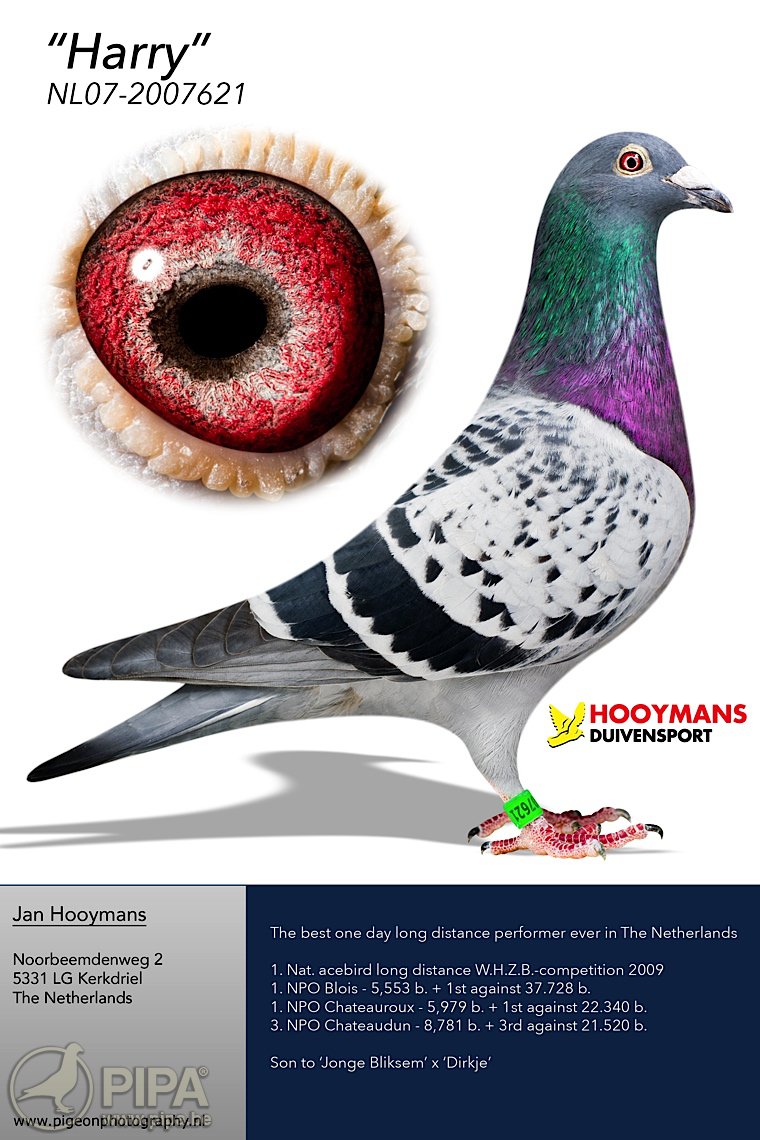 “哈利”是一羽天賦賽鴿,獲得布洛瓦37728羽冠軍、查特路22340羽冠軍、查特頓21520羽季軍,也是世界級種鴿。